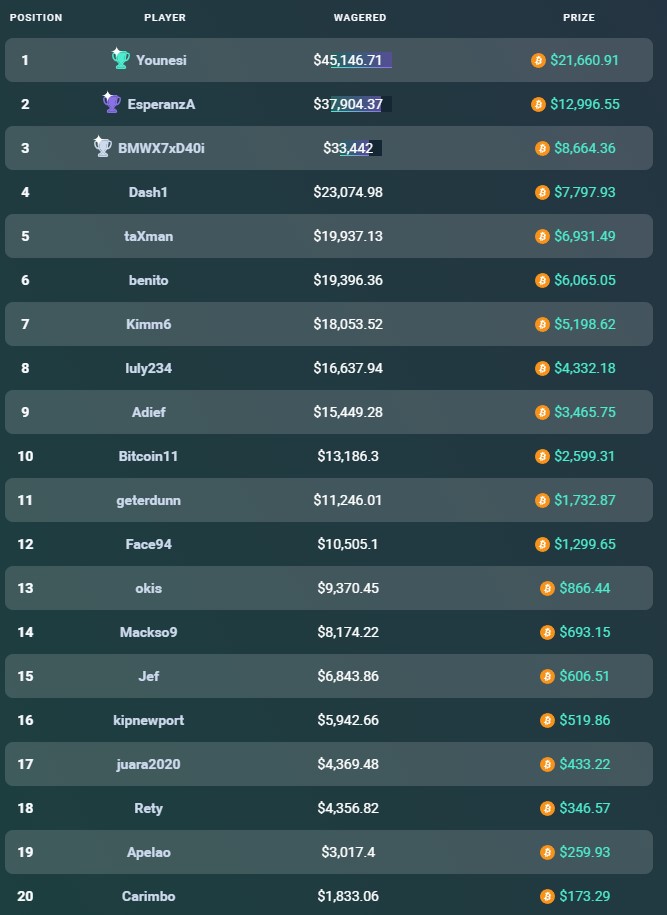 At the end of the event, the top 20 players share the 1 BTC prize pool.